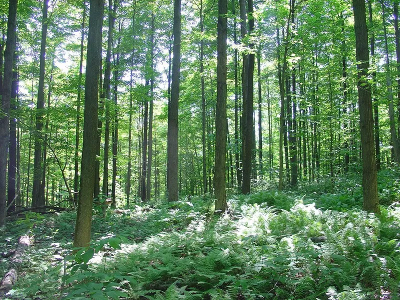 New York wooded land with garage for Sale: The property is almost entirely forested with a lovely mix of hard maple, soft maple, cherry, ash, hemlock, beech and more. There is a very nice plantation of spruce near the center of the property, providing another attractive feature for the new owner and excellent diversity for the resident wildlife. There is abundant deer sign throughout the property along with evidence of turkey throughout the hardwood forest.