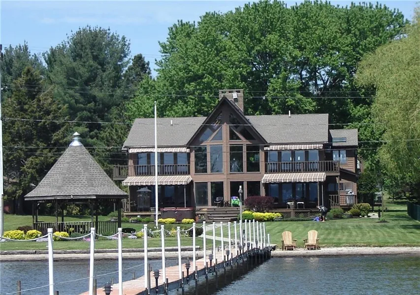 Large lakefront home with over 110 feet of lakefront. Porches and balconies face the lake. There is a private dock with slips for boats. Home has 5 bedrooms and 5 full baths plus half bath on first floor. Foyer and living room at center of house with main entry expand living space. Plus there is a hall and living space open to lower area and with windows facing lake. There is a large gazebo and fire pit towards the lake. Listing does not include guest house, but the gust house is available for sale. The kitchen is very complete and has many visual and practical amenities. Property is close to skiing, Chautauqua Institution, social, cultural and recreation in Jamestown. This parcel can also be sold with parcel number 062889-263-020-0001-012-000.