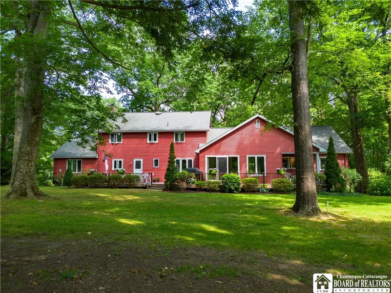 Located right alongside the Bemus Point Golf Course you’ll find this lovely 5 bedroom home. The expansive deck allows for outdoor enjoyment or simply relaxing while taking in the panoramic views of the golf course. Being in the Village of Bemus Point you’re an easy walk to Chautauqua Lake or to Main Street to enjoy the shops, restaurants and local community. This home has a very flexible layout. While the main part of the home features 4 bedrooms + 2.5 baths, the additional guest or in-law apartment located over the 3 car garage features its own bedroom/bathroom suite along w/ a half bath. This versatile space includes an additional kitchen w/ a beautifully designed open concept leading to a living room and dining area. It can serve as an extension of your living space, a private space for guests or an in-law apartment with its own entrance. Back in the main part of the house there are 2 spacious living rooms, one with a wood burning FP, the kitchen with plenty of storage and a nice sized dining room. On the 2nd floor is the primary suite w/ walk-in closet, 2 more bedrooms + another full bath. In the basement is a great bonus rec room + the 5th bedroom. This is a must see property!