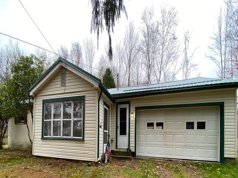 Must see to appreciate this two bedroom one bath ranch home on a quiet dead end street and sitting on approximately 1.75 acres. Enter from garage into a long foyer/laundry/utility room with coat closet and access to covered front porch with a porch swing. Kitchen newly remodeled with new laminate flooring, countertops, tiled backsplash, cupboards and stainless steel appliances. Bathroom has new tub shower surround, toilet and sink and flooring, freshly painted. Large dining area for entertainment has French doors that lead to a deck out back. Living room has new carpeting, new electric fireplace for back up heat provides for a cozy entertaining space. Also has a storage nook that could be taken out for a desk/study area. The primary bedroom has been freshly painted with new laminate flooring and wall sconces for ambiance, fits a queen size bed or a king. The secondary bedroom has new flooring and plenty of room for bed, dressers, desk etc. Some updated electric and plumbing. The yard is somewhat sloped with drainage added, partially wooded and is adorned with fruit and nut trees. Perfect spot for a small garden. This is a home you can't miss. Lots of potential.