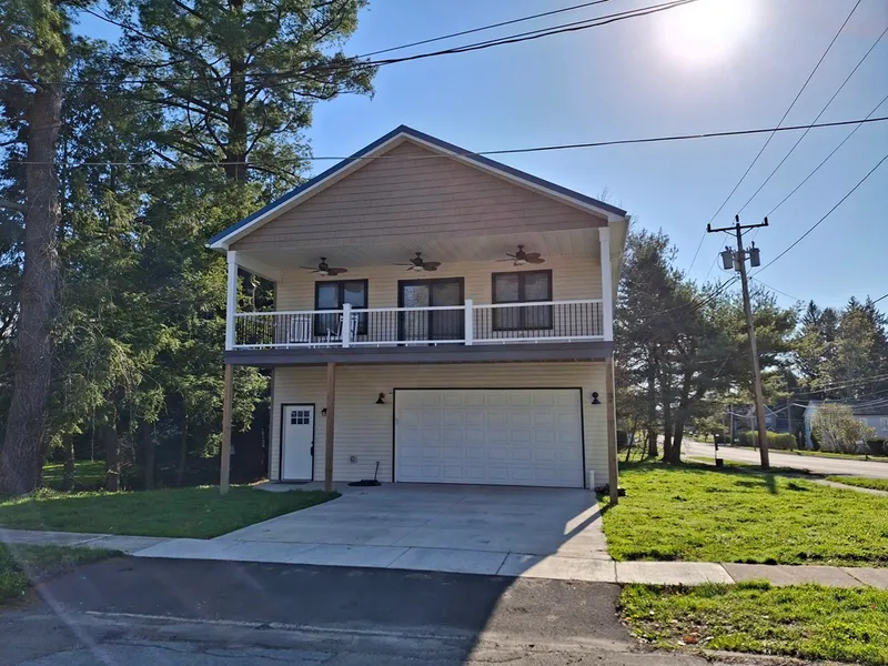 NEW BUILD-COASTAL DESIGN. Some may call it a MODERN CARRIAGE HOUSE with 4 car garage. Designed to elevate the main living area for better views and to take in the natural environment. The garage has a 16' W x 8' H overhead door with 10' ceiling, radiant floor heat, bar/TV area, laundry/utility room, storage, and full bath with tiled shower stall. Mini split heat/air conditioning units were installed in garage and upstairs for maximum comfort/back up heat. Garage floor is stained, polished concrete. Radiant floor heat is perfect for Vehicle, RV, or boat storage. Utility/laundry room houses on-demand hot water heating system. Windows in garage provide natural light and are covered in faux wood blinds for privacy. From the garage you enter at the base of the carpeted stairs which lead upstairs to an open kitchen/living/dining combo. The kitchen features stainless steel GE appliances ex. refrigerator, gas stove, microwave and dishwasher. The floors present as a luxury premium vinyl with a natural bevel. The countertops are a white marble. The breakfast bar provides a great space for extra seating or for just grabbing a quick snack. The open living area has 180-degree views and is open to the kitchen area and perfect for interacting with your family or guests. There is also space for a formal dining area to have a sit-down meal with family or friends. Off to the side there is a small office area or corner nook. There is also a thermostat upstairs to control the radiant heating downstairs. The three bedrooms have carpeted floors, spacious closets, and their own TV. Perfect for winding down in the evenings or waking up and watching some news. There is a full bath on the second floor with a tiled shower stall. Off the living room area through the sliding glass doors you can step out onto the balcony to enjoy a beverage or relax and take in the lake air with the cooling ceiling fans above. Close to shopping, restaurants, and Chautauqua Lake. Designed for luxury, comfort, and entertainment. Furniture is negotiable. Paid tax information have been used. The Town of Busti is reassessing and doesn't have the current tax rate yet for updated tax amounts