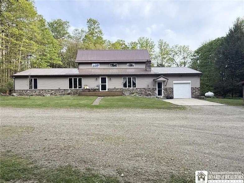 Rustic charm abounds with this beautifully decorated three-bedroom home set on four acres. The main floor has a cozy living room with a decorative masonry fireplace with a gorgeous natural wood mantle, and a window into the kitchen so you can still enjoy conversation with your guests when entertaining. The eat-in country kitchen has plenty of work space, granite countertops, and a pantry. There is also a formal dining room, a foyer, and a laundry room. The main floor has two bedrooms, a full bath, and a half-bath. The second floor is the master suite, complete with a private balcony, his and hers closets, and an en-suite bath. The en-suite bath has a Jack and Jill sink and a walk-in shower. Outside is an in-ground pool and a deck with a landscaped pool surround, perfect for hosting summer pool parties. The sprawling yard also has much to offer; trees surround the property and it feels very private. There is a fireplace ring and a play set. A one-car garage is attached to the house, and an additional two-car garage with electrical and an attached lean-to for storing your lawn care equipment. Please note that the fireplace should be inspected prior to use.