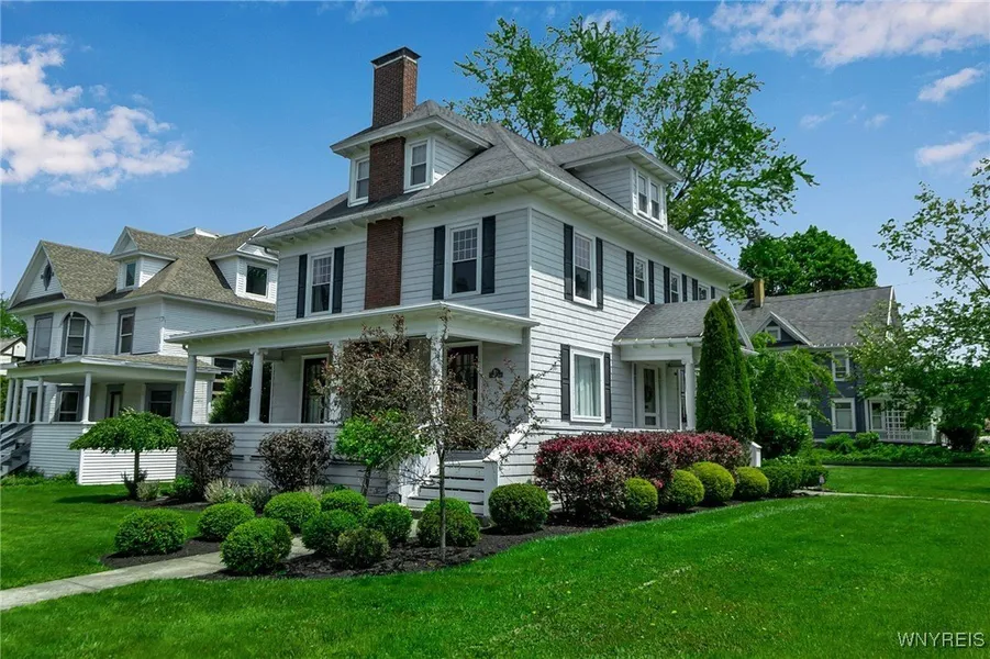 Exquisite Colonial Home Blends Old World Charm with Modern Luxury in Fredonia! Welcome to this stunning 5-bedroom, 3.5-bathroom, 3,400+ sq. ft. home, within walking distance of SUNY at Fredonia and all of the restaurants and stores in the village. This home has been meticulously updated to offer contemporary comforts while preserving its traditional character. Upon entering, you're greeted by a formal entry hall (8x21) with a graceful staircase. A practical side entry includes a mudroom (9x8) with built-in storage. The fully updated kitchen (17x13) is a chef's delight, featuring gleaming white soft-close cabinets, granite countertops, a pantry, stainless steel appliances, and a subway tile backsplash. The elegant dining room (17x14), complete with a gas fireplace, wainscotting, and crown molding, flows seamlessly into a sitting room (17x10)-perfect for after-dinner conversation. The expansive and bright living room, large enough for a grand piano, showcases a gorgeous wood-burning fireplace flanked by glass doors leading to a spacious, covered porch. A convenient half bath is located in the entry hall. The second floor hosts a primary en-suite bedroom (14x12) with a generous bath, along with three additional bedrooms and another full bathroom. The private third floor is dedicated to a luxurious owner's suite, offering an additional bedroom (26x22), a large full bath, and an impressive walk-in closet (23x10). Outdoor amenities include a large private concrete patio, the inviting covered porch, and a 2-car detached garage. This home offers an unparalleled living experience. Don't miss out!
