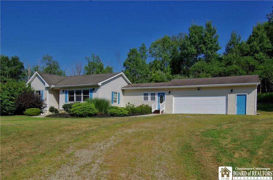 Newer ranch style home in the Falconer School district set on a very secluded 5 acre lot. If privacy is what you're seeking, you've found your home! You'll love the outdoors here as there is not a neighbor, building or road in sight. The 5 acres blends wooded area and the perfect amount of yard space. The floor plan of the house is very convenient, functional and will suit many different lifestyle needs. Enter into the mudroom and drop your bags, take off your shoes and coats, wipe the dogs paws and anything else you don't want to mess up the main living space! Pass through the super convenient laundry room and enter the great room. The kitchen comes equipped with appliances(most almost brand new!) and has a breakfast bar for those "on the run" meals. Ideal for entertaining, or just to keep the family close, the kitchen is open to the dining area, living room and office space. The 12x14 sunroom is the ideal place to read a book, chat with friends, watch the game or just get that well deserved rest and relaxation. There is a bonus space on the main level which works well as an office space, playroom or as a den. The primary suite includes a full bath and two double closets with organizers. The basement is partially finished and this is where the 3rd bedroom was utilized. There is also a full bathroom and family room space. The unfinished section of the basement has tons of space for storage and houses the mechanicals. Don't worry about power going out as the home has a whole house Generac generator included! The public record has the property as a 3 bedroom/2bath home. There are in fact 3 full baths. The 3rd bedroom was in the basement and should be noted that it has no privacy from the additional living space in the basement. The "office" space on the main floor may have been intended to be a 3rd bedroom in the original plans.
