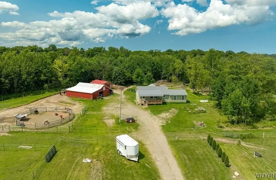 This 20+/- acre property in Chautauqua County offers a remodeled ranch home, barns, pastures, fencing, and a pond. Recent updates include roof, siding, heating, cooling, septic, and well pump. The barn features stalls, a tack room, hay storage, and run-in areas, making it ideal for horses or livestock. Trails run throughout the acreage, connecting to snowmobile and riding trails. A garage, chicken coop, and hunting stand complete the propertys versatile setup.