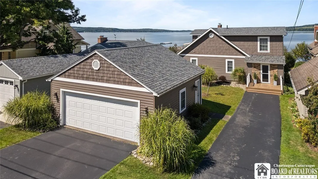Chautauqua Lake Lakefront Home - Year-Round 4BR/2.5 Bath Home in Southwestern School District! Enjoy lake living all year long-swimming, boating, ice fishing, snowshoeing, and cross-country skiing right outside your door. This spacious home comfortably sleeps up to 17 people, perfect for family and guests. The first floor offers two bedrooms and a full bath, plus, a welcoming front entry room with pull-out couch and half bath for visitors. The second floor features a primary suite with walk-through closet, full bath, sitting room, and a private covered balcony overlooking the lake, along with a huge additional bedroom that sleeps up to nine. The large living room includes a wood-burning fireplace, fully rebuilt in 2022. Bright kitchen with amazing lake views! Separate bar room for entertaining! Extensive renovations were completed in December 2022, including: new roof, siding, vinyl windows and doors (house & garage), 200-amp electric service, new flooring, carpets, fresh paint, two-tier walk-out covered decks, patios with built-in fans, lights, and ambient step lighting. The walk-out heated basement provides a workbench and laundry area. A 2.5-car detached garage with dual doors offers excellent storage. All public utilities-water, gas, electric, and sewer. New landscaping added in 2024. Negotiable: 2022 Bennington pontoon boat (only two seasons on the water), 2022 boat lift, and most furnishings. Fantastic location-just minutes to the Village of Lakewood, restaurants, shops, Big Tree Ice Cream, mini golf, a movie theater, and one mile from Southern Tier Brewery. Quick drive to Wegmans, Target, Home Depot, Long Point State Park, Bemus Point, and Peak 'n Peak Ski Resort!