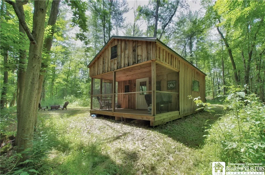 Within seconds of passing through the gated entry you'll start to feel the stresses vanish. As you pull up to the cabin the relaxation sets in. Welcome to your little slice of paradise. The 30 acre(approx.) is located just minutes from the town center of Frewsburg but feels like you're in the middle of nowhere. The majority of the lot has very little grade and multiple trails blazed making it very easily accessible. While hiking or 4 wheeling on the trails take time to pick fresh raspberries and blackberries, observe the wide variety of flora, and take in the sounds of nature that surround. The cabin has a solar panel to provide some power, a loft area for sleeping, a wood stove to keep warm and an screened porch to protect from bugs. Just steps from the cabin you can access the creek. An outhouse was built using trees on the property. Storage shed also included. Incredible hunting on th...