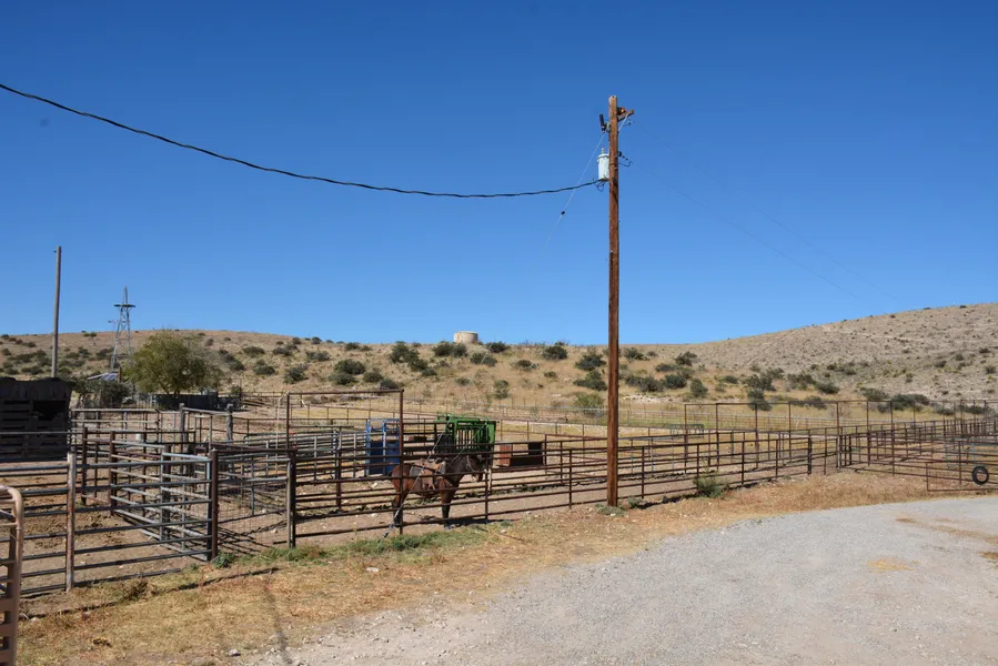 Situated on the east side of the ranch is the headquarters consisting of a good set of steel pens with a cattle working chute, a barn/shop, an old school house converted to a tack room, twin overhead cake storage bins, a domestic well (one of the five wells on the ranch) equipped with a submersible electric motor and pump and a concrete storage tank. Also located at the headquarters is a very nice up-dated home which consists of three bedrooms and two baths, a living area with a fireplace, and a combined dining room and kitchen. Surrounding the home is an adobe fence.