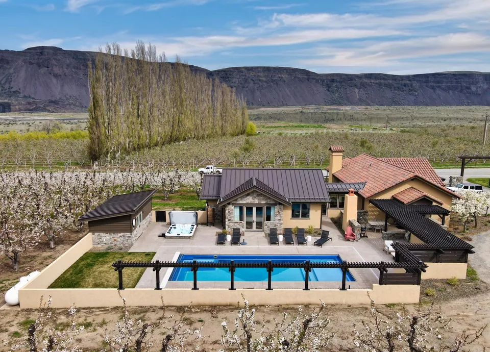 An extraordinary 80-acre estate nestled in the heart of the Wenatchee Valley, Ravenwing Ranch offers a rare blend of elegance, privacy, and productivity. Surrounded by a thriving, income-producing orchard of mature cherry and apple trees, the property features two spacious homes, a large shop, and stunning river views. Imagine stepping from your master bedroom directly to a private pool and hot tub, or transforming the 3,200 sq ft garage into a winery tasting room to take full advantage of the setting.