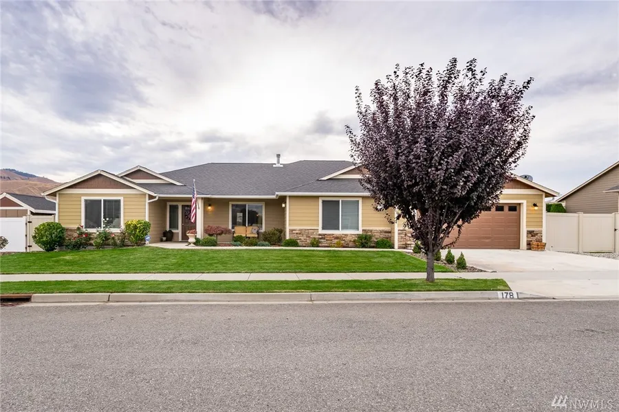 This 2,538 sq. ft. custom rambler offers 3 bd 2.5 bath, custom tile entry, roomy den/office, large bonus room with fireplace, open great room with vaulted ceiling, maple hardwood floors and beautiful floor-to-ceiling fireplace. Spacious kitchen features granite counters, all stainless appliances and island seating. Large dining area features sliding door exit to covered patio. Butler pantry with fridge, outdoor patio, hot tub and TV. All wheelchair accessible.