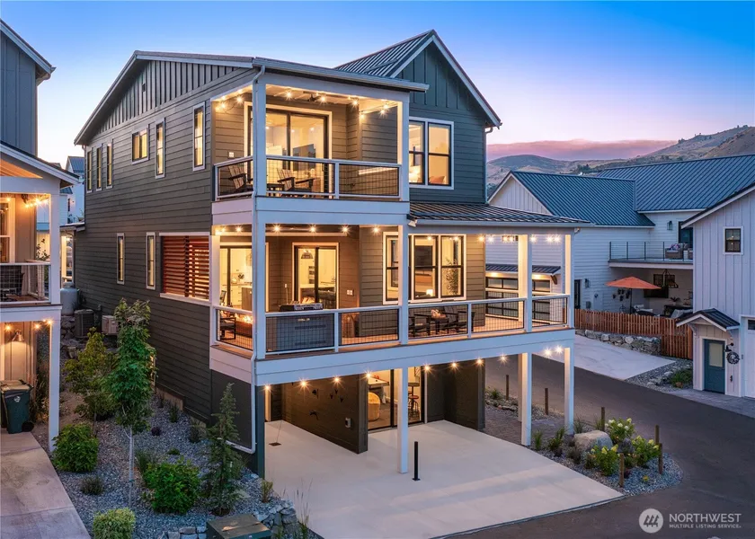 This stunning, fully furnished 3,386 sq. ft. income producing designer home at The Lookout offers 5 bedrooms, 5.5 bathrooms w/ luxury finishes throughout. Bright and spacious open-concept main floor featuring a large living area w/Lovesac sectional, 65" TV, and Sony sound system. Fully equipped chef's kitchen w/high-end KitchenAid appliances and wine fridge. Enjoy 880 sq ft of outdoor living space w/ wraparound porch, upper decks w/views, Blackstone grill, firepit, outdoor shower, and hot tub hookup. Additional features include custom blinds, double washer & dryer, game/media/office rooms, and EV charger. The Lookout offers a private marina, waterfront, parks, playgrounds, heated pools, hot tubs, sports courts and onsite rental management.