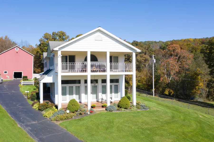 "Breezy Pines" a Private yet not Remote property with timeless beauty, set into the hills of the Southern Tier of NYS, just minutes from the City of Elmira. Pulling up the slightly winding drive, to the right you find a grand home, reminiscent of a Southern Mansion. The perfectly designed Master Suite is 1100 square feet encompassing a large bedroom with fireplace and sitting area, a spa room with huge spa tub private vanity and hidden walk in closet is at the back of the spa. A full size bathroom with tub/shower, built in vanity, water closet and another hidden walk in closet complete the interior spaces of the Suite. French doors take you out to a second story porch to enjoy private moments without leaving your Suite. The meticulously maintained grassy fields and 246 wooded acres complete this exquisite property. Just 17 Miles/29 minutes from the Elmira/Corning Regional Airport. Onsite...