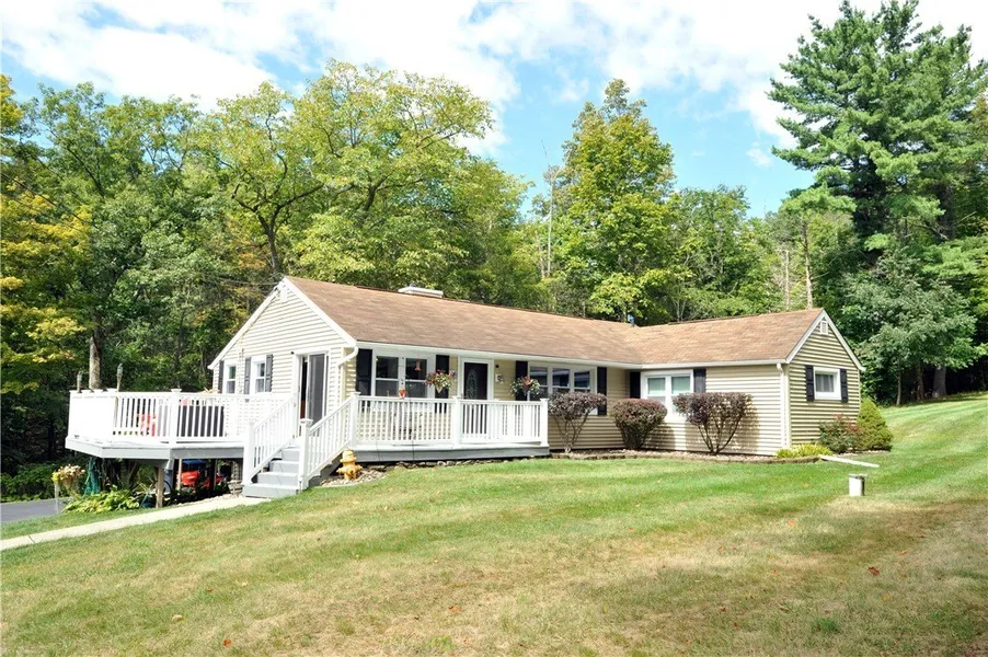 Welcome to this beautifully renovated ranch-style home, offering 2,048 sq. ft. of living space on 2.4 private acres. Featuring 3 bedrooms and 1.5 bathrooms, this home blends modern updates with inviting charm. The open-concept kitchen and living area boasts a cozy fireplace, abundant natural light, and a stunning updated kitchen with granite counters, a new refrigerator and microwave. The walk-out lower level is perfect for entertaining. It's been completely renovated with a bar, hardwood pellet furnace, half bath, and laundry area. Step outside from the kitchen onto a spacious wraparound deck that overlooks the yard, creating the ideal setting for outdoor gatherings. Enjoy summer days by the new above-ground pool and deck or relax around the built-in fire pit on the concrete patio. Practical features include a large, paved driveway with ample space for cars, RVs, or campers and a genera...