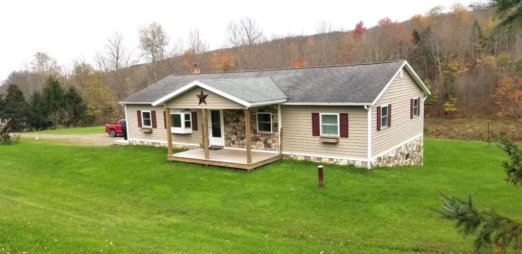 Nice quiet country property overlooking Sing Sing Creek, a year-round running stream, that meanders across the property. This house offers 1,225 sq. ft. including a spacious kitchen with newer appliances, 3 bedrooms, 1 bathroom on the 1st floor and a bonus room in the basement. The kitchen offers granite counter tops with a built-in microwave, a dishwasher, a garbage disposal, and a generous sized dining area. Freshly painted walls throughout the house. At the far end of the house is the master bedroom with vaulted, raised ceilings. Several closets throughout the house for plenty of storage. There is a full walkout basement that is partially finished with existing plumbing in place to add an additional bathroom. The basement has full height ceilings and is very clean with plenty of natural sunlight. Recently installed Hi-Efficiency propane furnace, and a coal stove are located in the basement. The exterior of the home is wrapped in Vinyl siding for low maintenance, and there is a small attached porch.