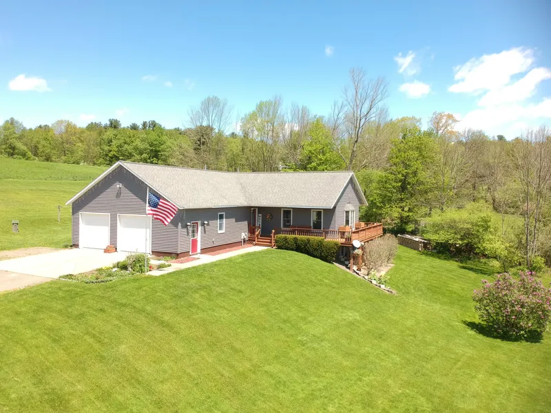Offering privacy with views and tranquility with utility. A homestead on hill with all the modern conveniences for relaxing and entertaining, even a wine cellar. This home was built in 2006 and has all the features desired, cathedral ceilings, open floor plan, stainless appliances, large master with en-suite, attached two car garage and plenty of windows with long range views. This home is bright and airy, is kept incredibly clean and grants tons of closet space. Tremendous walk-out basement offers a bedroom, gym space, canning hutch and pantry, wood burning stove, and plenty of storage room. In addition, youll discover an enormous bar and billiard room which features French doors leading out to a grilling patio with Gazebo. Included in the sale are the billiards table, gazebo and barbeque. This fabulous 41 acres also offers maturing pine wind blocks, several apple tree varieties, blueberry bushes and peach trees for starters. The woods hold a secluded and private cabin that could be a tiny house or she-shed. Enjoy ample wildlife along the existing trails, including plenty of deer. Hilltop hayfields convey both sunrise and sunset views year-round and would be great for a crop farm such as hemp. Two enormous barns are just waiting to be put to good use and could house any number of pursuits. They have been caringly stewarded to remain purposeful and are ready for the next generation. Literally move in and start living the lifeor just sit on the wrap around porch.