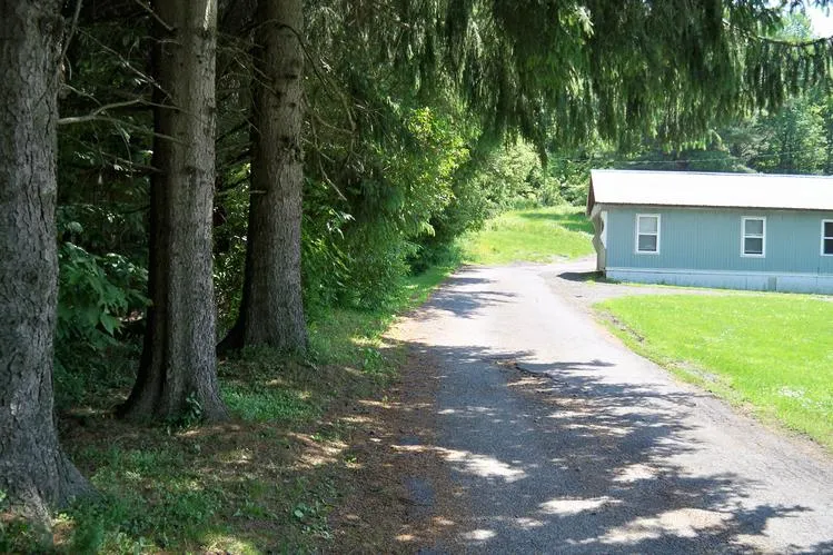 4.97 surveyed acres; Tree lined black top driveway; Large lawns; Plenty of parking; Year round small stream.
