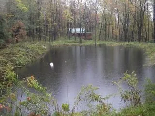 This finished 16 x 24 cabin with a 30 x 22' covered wrap-around deck sits in a picture-perfect setting on a fully stocked, 1/3 acre swimming pond. The cabin is off-grid with all the necessary amenities for comfortable time spent at camp with water and power. The lighting and outlets are powered by a battery bank/generator. There is also an alarm system. Running water is fed by a rainwater-harvesting cistern behind the cabin. A large 12' x 8' storage area under the cabin stores deep cycle batteries, propane, generator, bikes etc.