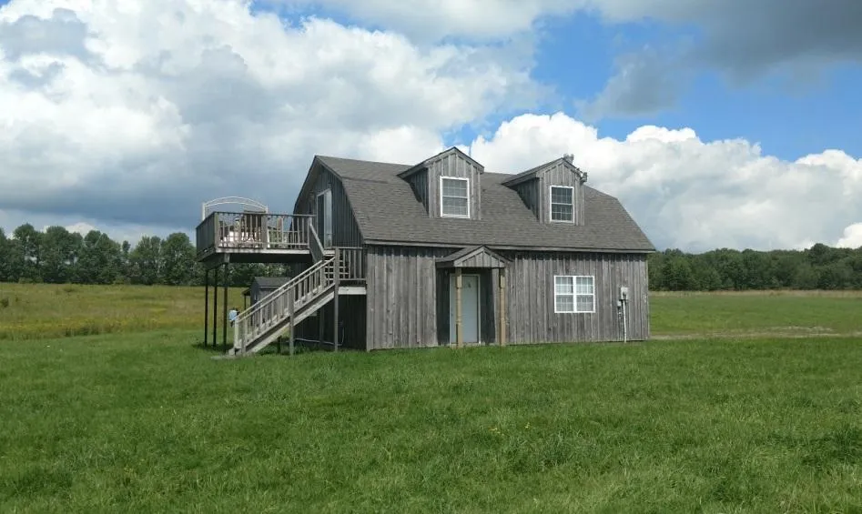 For those seeking the peace and solitude of the Country. This well built 2 story two bedroom cabin sits down a long gravel driveway & overlooks a private 1 1/2 acre stocked pond. On over 40 acres of prime land. The ground floor heated garage is completely finished and features a laundry room and work shop. Can be easily finished for additional living space. Upstairs features two bedrooms and a full bath with a jetted tub and stand up shower. Living room with wood stove. And a nice eat in kitchen with a balcony overlooking the pond. Separate out buildings include a 14x14 two story barn with sky light and a 10x20 utility. The land is gorgeous and features long distance views, 20 acres of open tillable, 12 acres in mixed hardwood and the rest in pasture. The pond is about 12-14 feet deep, has a dock, floating dock for swimming and holds plenty of bass and perch to keep you and the family bu...