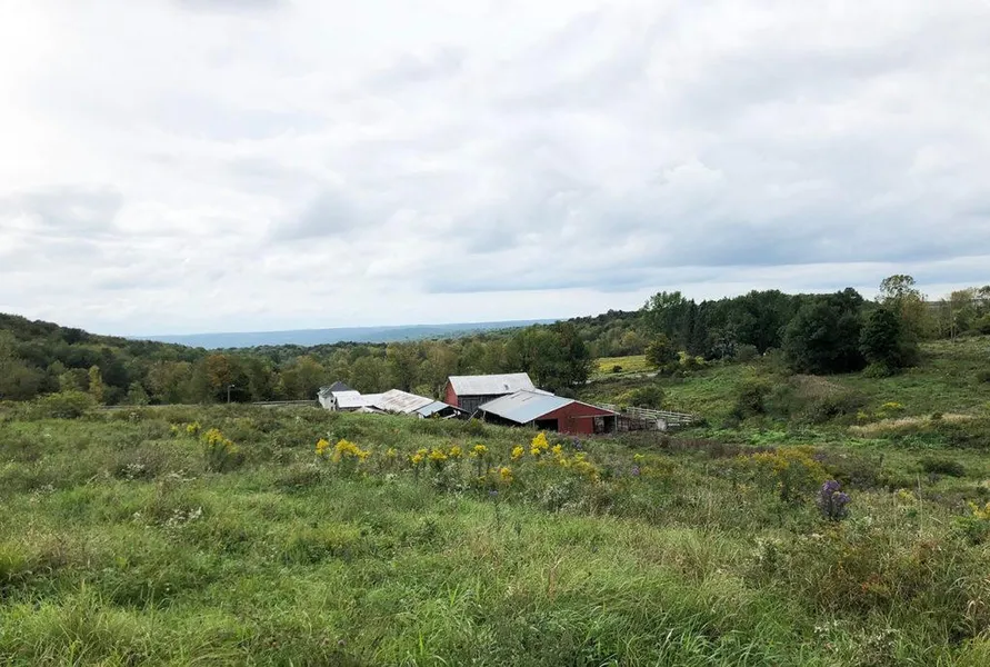 96 acres vacant cattle farm with barns, pasture, woods, stream, springs and views in Guilford NY, Chenango County.