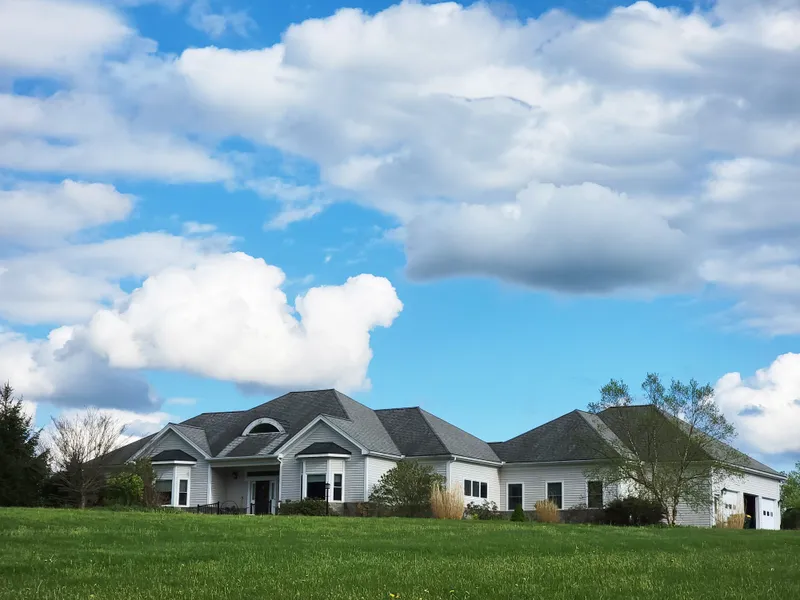 A spacious executive home near Binghamton with its 14' ceiling grand entry foyer has three bedrooms with 10' ceilings throughout the house, all on the handicap accessible first floor. Enjoy the views looking across the Chenango River valley to see the verdant hills of central New York State in the distance. This exclusive rural development of Sherman Road is just north of the Village of Greene, an easy half hour commute to Binghamton. Bright natural lighting abounds throughout the home with cathedral ceiling height windows facing the views. Enjoy living outdoors with the abundant large windows of the sunroom with 14 ceilings and double French style patio doors facing the valley and the extensive decks in back of the house. The wide sweeping level lawns around the house are golf course green with landscaped gardens. This move-in ready, thoroughly modern villa with many windows facing the ...