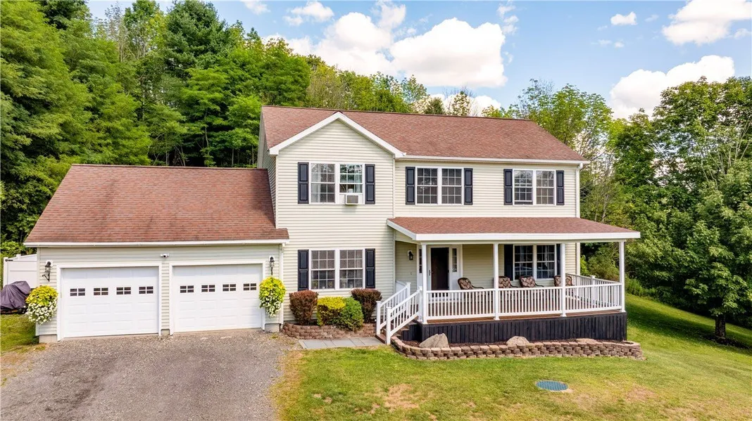Secluded Colonial on 10 Acres with Inground Pool & Finished Basement. Nestled on 10 mostly wooded acres, this 2007 Center Hall Colonial offers the perfect blend of privacy, comfort, and modern design. Featuring 3 bedrooms, 2.5 baths, and over 3,000 square feet of living space, this home checks all the boxes for today's lifestyle. The expansive eat-in kitchen is a true centerpiece, showcasing granite countertops, tasteful cabinetry, stainless steel appliances, pantry, and laundry room-all opening to an expansive Trex deck overlooking the inground pool and peaceful & private backyard setting. The front of the house offers a new covered porch/deck for full day outdoor relaxation and entertaining options. Returning inside, a spacious Family Room with a cozy woodstove, plus a formal living room off the front entry, complete the first floor. Upstairs, retreat to the primary suite with double w...