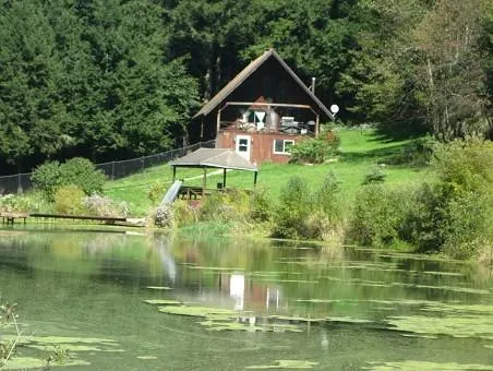 Rustic 3 BR, 1 1/2 BA chalet on 8 acres. 2 stone fireplaces, finished basement with wet bar. All appliances will stay. 1 acre pond with a deck and gazebo. Very private setting.