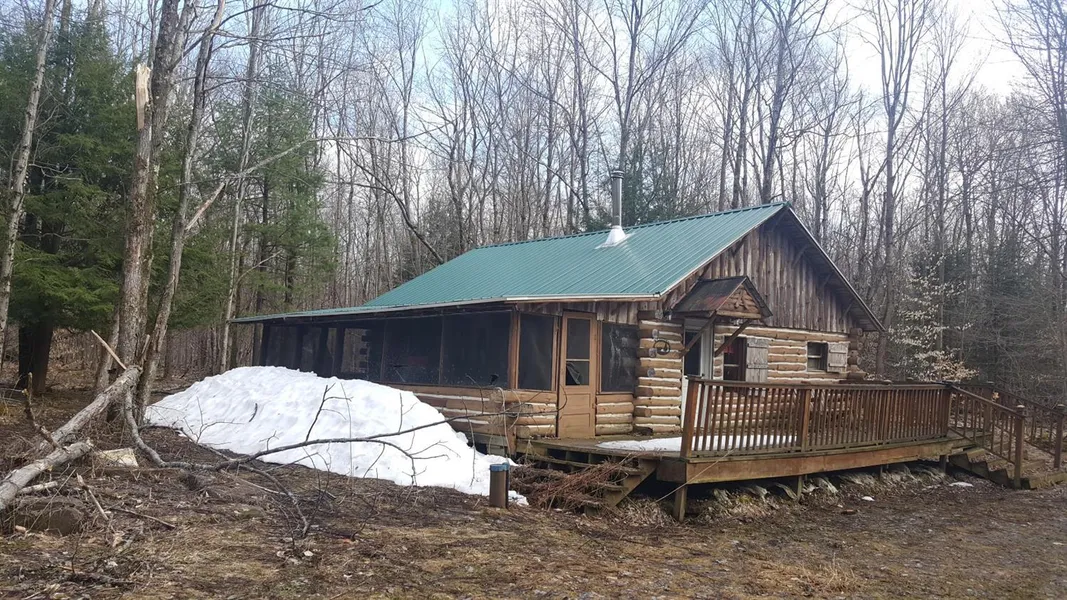 Log Cabin in the woods on 27 plus acres BORDERING STATE LAND on three sides and farm land on the other. Long driveway takes you back off road to a solid log cabin that was built using old style construction. Cabin offers all amenities of home. Land features mostly hard wood, some wet areas for potential pond sight but mainly dry and level. Wildlife signs on every corner. Excellent hunting! Also Has a has a 10x28 Storage shed. Perfect for a peaceful get away or hunting cabin.