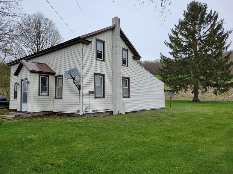 Nestled between two major State Forests, this property has great potential for a hunting or vacation getaway in the country. There is a 1115sf 2 story farmhouse which would make a good base camp. The second floor is partially unfinished and could provide additional bedrooms when completed. The first floor has a kitchen, laundry, living room, extra room for bedroom or den and a full bath. There is an outdoor wood boiler that provides heat and hot water to the house.. Additionally, there is an electric hot water heater and oil furnace for use as well. The property has access via the Finger Lakes Trail to Mariposa State Forest along its back side, providing an additional 3002 acres for hunting, hiking, and camping as well as miles of snowmobiling trails available for winter fun as well. The renowned Finger Lakes Trail runs along the edge of the parcel, follows the road in front of the house...
