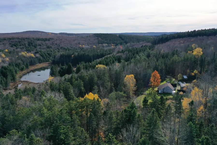Storybook location for this peaceful and private home nestled in a clearing in the woods, bordered on two sides by 4526 pristine acres of the Pharsalia Wildlife Management Area. This property could be your ideal hunting cabin, vacation getaway or year-round home. Situated on a year-round maintained town road, at the end of a long gated driveway, the Cape Cod style house offers 1675 square feet, built in 1975 and comes with all utilities in place: well, septic and electric power. With vinyl siding for low maintenance, the house features 2 bedrooms and a full bath with a laundry room as well as a loft for additional living space or storage. The focal point of this home is its Great Room with cathedral ceilings and a floor-to-ceiling wood-burning fireplace, providing a memorable space for relaxing and loads of room for entertaining. Just off the Great Room, the nice-sized, separate kitchen features shaker-style oak cabinets and comes with a refrigerator, microwave and gas oven/range. There is a first-floor washer and dryer for easy laundry. The house features 200 amp service and is heated by propane wall units in addition to the fireplace. The property lies on a gentle grade up from the road and has a trail system providing good access around and to the back of the property. The woods are a mix of hardwood and pine, mainly spruce, red pine, beech and maple. A small pond for a water source and a stream that borders the northern edge of the property is available. Several outbuildings can be used for a garage, workshops, barns or storage. In addition to its own 51.63 acres, the property borders the Pharsalia Wildlife Management Area on two sides, offering another 4625 acres for hunting, hiking, fishing, camping & snowmobiling. In addition, the Beaver Meadow State Forest (5816 acres) is 1.5 miles away and 4.5 miles away from the New Michigan State Forest (1180 acres). In an area of NYS renowned for its wildlife conservation practices, a variety of wildlife lives and prospers here with whitetail deer, wild turkey, grouse, beaver, fishers, squirrels, hawks, bald eagles, songbirds, raccoon, coyote, ducks, woodcock, among the many species. Fishing in the nearby Canasawacta Creek and Otselic River for trout, bass, pike, walleye and perch, among other species. Amenities, restaurants and shopping are available in Norwich, 14 miles away, while Binghamton & Syracuse are both within an hour's commute. NYC/George Washington Bridge is 3.5 hours away.