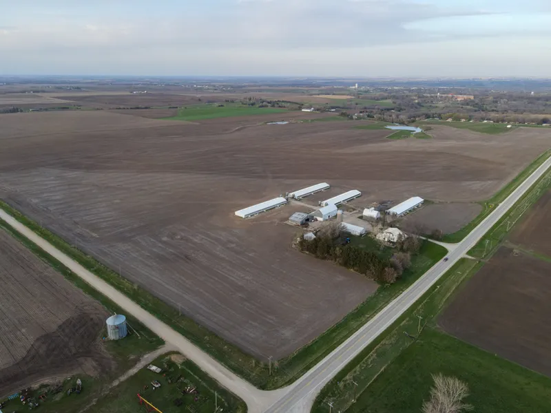 Located just outside of Cherokee, Iowa on 40 +/- acres are 4 1,000-head finisher buildings, 31 +/- tillable acres, a lovely home, and several outbuildings! They have a deep well and rural water backup. North barns are 42'X 208' with new gates and wet-dry feeders. The northwest building has a brand-new curtain. Gates swing to be able to adjust pen size or pre-sort. The steel on the roof is less than 4 years old. Each building has two 15-ton bins and they have their own propane tank. They are curtain-sided with linear actuators for a south curtain and run on a car battery which allows 12 hours capacity without electricity. They have 6 pit fans with 3 on the south and 3 on the north and both buildings have stir fans. They were built in 2000.