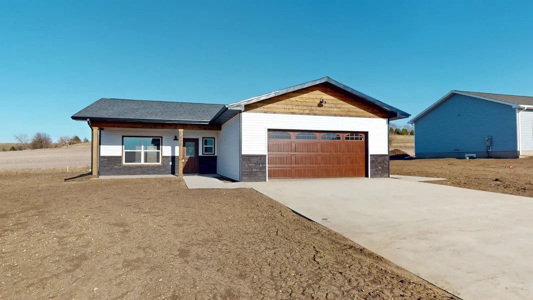 Tired of damp basements? Have you ever considered a Pad Home? These homes are constructed on top of a concrete pad with no basement. Everything you need is all on one level and this one was just recently completed. Here is your chance to get into a Brand New Home and be the only person that has lived there for under $250,000!!! We are selling 100 year old homes for more than this! You are sure to love the feel of new especially when it offers a nice master ensuite, 2 additional bedrooms, a guest bathroom, beautiful kitchen, open concept living area, laundry area, and a two car attached garage. The home even has 9 ft ceilings with tray ceilings in the living room and master bedroom. There is an electric wall mount fireplace in the living area as well! The home is setup to be fully electric. Come check it out and be sure to step out on the back patio to take in the rural view that you usually don't get in town, you might even catch some deer or turkey walking around!!