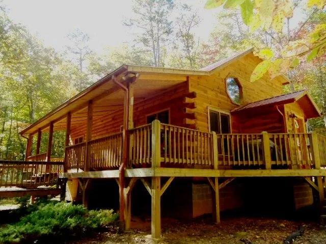 2BR/2BA real log home on 1.51 ac. with small creek. All wood interior, bonus sleeping loft, kitchen pantry, black appliances, garden tub in Master, Rock Fireplace with gas logs, central heat and air, covered front porch, and metal roof.