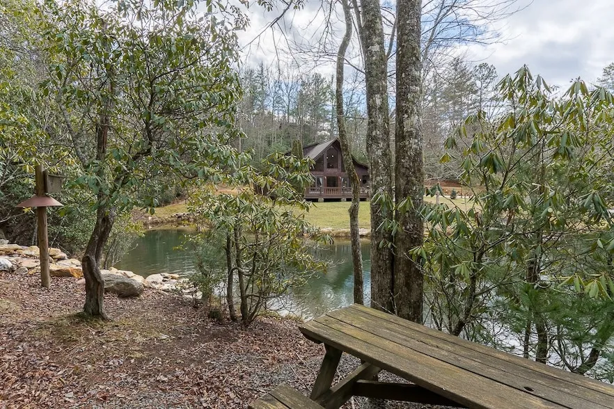 STUNNING 3BR/3BA FURNISHED CHALET ON 2.38 ACRES WITH STOCKED POND AND DREAM GARAGE. Escape to this breathtaking mountain chalet situated on 2.38 acres of pristine land, featuring a spring-fed, stocked pond with a picturesque waterfall spilling into the water, creating a peaceful and serene atmosphere. A wall of windows frames the stunning natural views, bringing the beauty of the outdoors in. The home exudes warmth and rustic charm with gorgeous tongue-and-groove wood ceilings, adding character and a cozy, cabin-like feel throughout. The open-concept living area is centered around a stone fireplace, perfect for relaxing evenings. The main level offers a spacious primary suite, a second bedroom, and a full bath, all designed for comfort and convenience. Upstairs, features a complete home theatre system with 120" screen, projector, surround sound speakers for home movie nights. Storage is no issue in this home, with tons of cabinetry, large closets in every bedroom & bath. Additional ample storage throughout, whether it's kitchen essentials, outdoor gear, or seasonal dcor, there's a place for everything. Outdoor lovers will appreciate fishing from their dock in the serene setting, while the 26x36 garage is a dream come true for hobbyists & car enthusiasts. This home is a perfect blend of rustic elegance and modern convenience. Don't miss out on this rare gem your perfect mountain retreat or forever home awaits!
