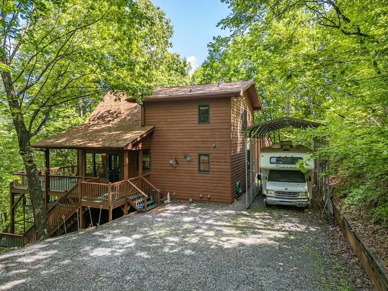 Charming Mountain Chalet with RV STORAGE: Discover mountain living at its best in this well-maintained 3-level chalet just minutes from downtown Murphy with paved road access. Featuring beautiful tongue-and-groove wood ceilings, rich wood floors, and an open floor plan with large windows, this home is filled with natural light and offers a peaceful, treehouse-like feel surrounded by nature and elevated among the treetops. The main level offers a spacious bedroom and full bath, while the loft hosts the primary suite complete with a full bath and cozy mountain views. The stacked stone fireplace adds warmth and character, and the kitchen boasts new stainless steel appliances and granite countertops. The finished lower level is ideal for an in-law suite or guest quarters, complete with private access and a screened-in porch for enjoying the peaceful outdoors. Multiple wrap-around porches offer additional space to relax or entertain in the fresh mountain air. Outside, you'll love the large outbuilding, attached storage room, and RV carport, giving you ample room for all your vehicles, tools, and toys. A rare find with space, flexibility, and charm just minutes from the heart of Murphy!