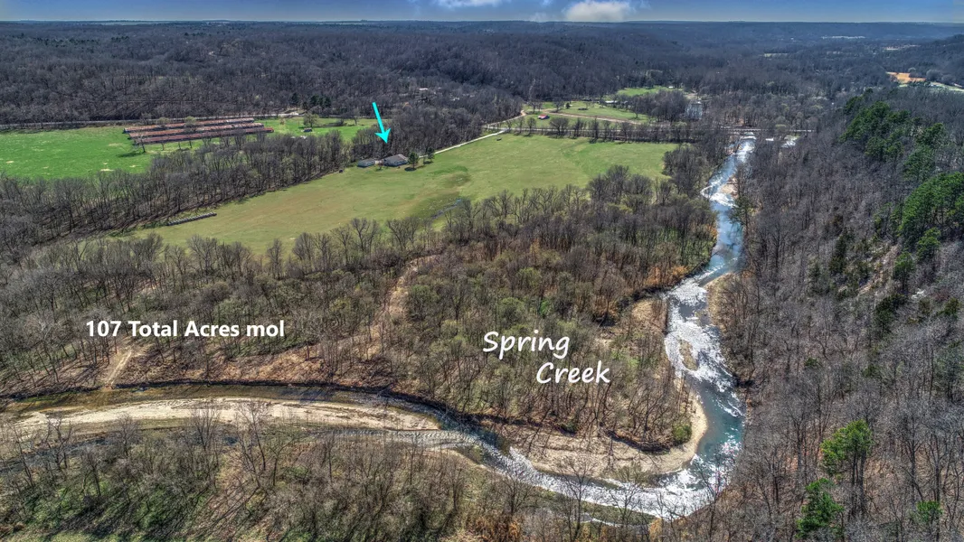 Gorgeous home added onto; updates include Brazilian Koa wood floors, kitchen and baths done by Bob Avery with Imperial Kitchen and Baths, Knotty Cherry custom cabinets, newer windows, siding and brick situated on 107 beautiful acres w/ 1/2 mile of Spring Creek running thru property. Includes 3 wells, detached garage, sheds, outbuildings you could re-purpose for any needs, pasture, and pond.