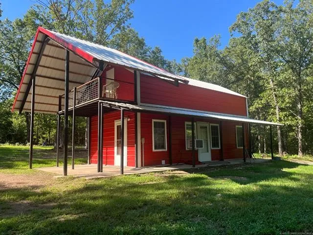 Your own slice of Heaven! This 803 sq ft (per CH) metal sided home was built in 2018 & has been well maintained! Low maintenance exterior metal posts, metal roof all work together for low utilities & easy living! The charming exterior prepares you for what you can expect inside! The rustic charm from the beautiful notty wood cabinets, distressed metal walls, the old barn wood look L.V. flooring and attention to details set the stage! Stainless fridge, dishwasher, & stove convey with the home as well as the washer/dryer! The tax records count 3 bedrooms, with one on main floor and the other 2 up the ladder & across the catwalk! The upstairs balcony is covered and makes the perfect relaxing spot for evenings! The home has a tankless water heater, wood stove, RV hookup & dump, an oversized 2 bay carport, a shipping container for storage & a small shed! All tucked away on 9.8 acres near Illinois River with NO restrictions!