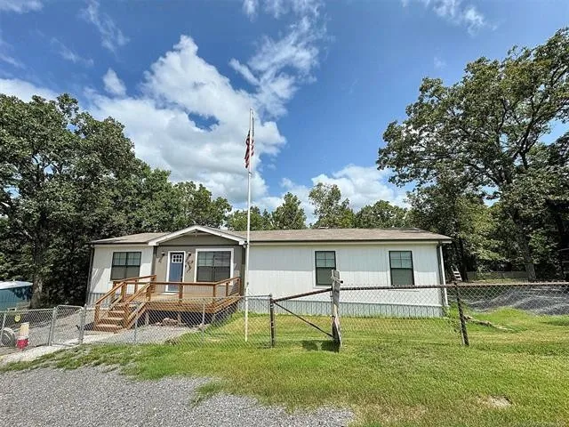 Welcome to your dream lakeside retreat at Lake Tenkiller! Nestled in wooded surroundings, this gorgeous new 3-bedroom, 2-bathroom double wide is a sanctuary of comfort and style. Step inside to discover a spacious open floorplan adorned with Sheetrock walls, rustic ceiling beams, and charming ship lap details, creating a warm and inviting ambiance. The heart of the home boasts a huge island, perfect for entertaining guests or enjoying family meals. Luxury meets functionality in the dreamy primary suite featuring a sumptuous soaking tub, ample storage space, and a serene atmosphere for ultimate relaxation. The split floorplan ensures privacy, while a charming organizational niche adds character to your living space. No detail is overlooked in this immaculate home, from the durable LVP flooring to the convenient walk-in pantry and oversized laundry room designed to accommodate your needs with ease. Step outside onto the expansive 32x10 pressure-treated deck, offering views of the surrounding Corp land and abundant wildlife. With only a mile to the boat dock for Lake Tenkiller access, you'll enjoy endless outdoor adventures right at your doorstep. Plus, the RV pad and fenced yard provide added convenience and security. Experience the best of lakeside living with this exceptional property, meticulously set up for FHA and VA approval, ensuring a smooth and hassle-free buying process. Don't miss your chance to make this stunning retreat your own slice of paradise. Schedule your viewing today!