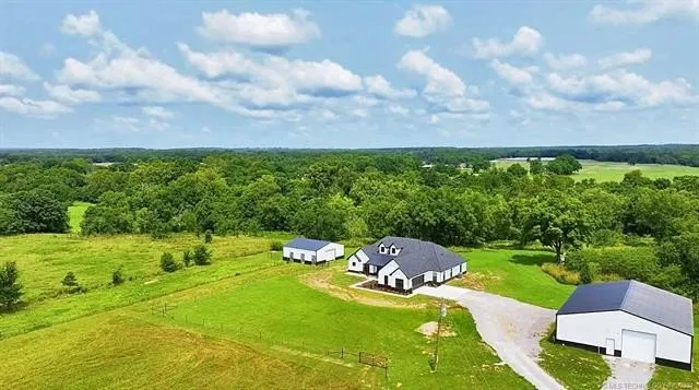 Discover the epitome of modern living with this custom-built 2023 home, designed with energy efficiency at its core. Boasting 2x6 exterior walls, solid surface window ledges, and full encapsulation, this residence offers unparalleled comfort and sustainability. Step inside this exquisite 4 bedroom, 2.5 bath home and be greeted by luxurious features. The spacious living room, highlighted by a sleek fireplace, flows seamlessly into the open floor plan, connecting the formal dining room, large breakfast room, and gourmet kitchen. Culinary enthusiasts will appreciate the kitchen's top-of-the-line 6-burner gas range, double oven, pot filler, granite countertops, quartz-topped work island with prep sink, ice machine, restaurant-style fridge/freezer combo, walk-in pantry, and butler's pantry/coffee bar with vivid custom tiles. Easily work from home in the office with built-ins, and enjoy the convenience of a built-in pet nook for your furry friends. The primary bedroom features an oversized layout, a designer geometric accent wall and a spa-like bath with a soaking tub, tiled shower and an enviable closet. Natural light floods the home through large windows, and the covered patio, accessible via sliding glass doors, offers a tranquil outdoor space with a remote-controlled Phantom Screen for privacy, temperature regulation and insect deterrence. Set on 20 acres, this property is perfect for horse enthusiasts, complete with a 3-stall barn and horse run. The 50x60 insulated shop with HVAC, living quarters, and drive-through 12' overhead doors is ideal for storing your boat, RV, or tractor, and includes a 50amp outlet. Enjoy summer fun by the small pond and along 14 Mile Creek with its solid rock bottom, located on the north property line. The gated entrance and the distance from the county road ensure utmost privacy, making this home a secluded sanctuary. Don't miss the opportunity to own this property that combines luxury, functionality, and natural beauty.