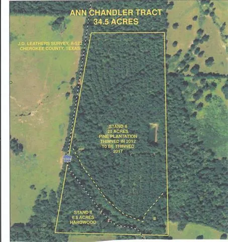 Wooded 34.5 acre tract with plantation pines planted on 28 acres in 1995. Pine timber was thinned in 2012 and should be ready to thin again in 2017. Approximately 6.5 acres of tract is across the county road and is hardwood timber. Small pond on property.