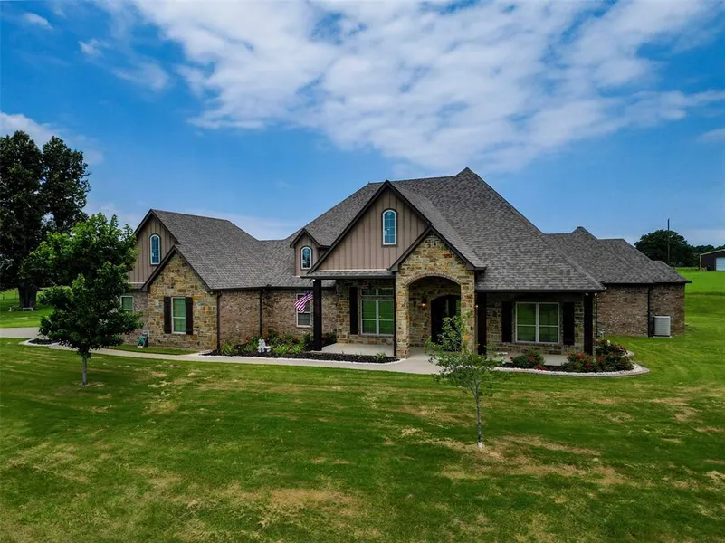 Undeniable elegance radiates from this Colorado inspired mountain home with Texas style luxury in Bullard. Set atop a hill, this 5 bedroom, 3.5 bath home with its generous 3 car garage crafted by builder, Vic Thompson, provides sweeping views of the surrounding 5+ acres of lush meadows. Scraped hardwood floors welcome you and extend throughout the home providing a rustic sophistication. The floor to ceiling stone WBFP is the focal point of the family room. The windows and French door across the back wall are draped with motorized shades for effortless convenience. The gourmet kitchen is equipped with a six burner gas range, pot filler, large granite island with seating, double ovens, walk-in pantry and more. The home's five bedrooms are arranged in a split design. Take the party outdoors on the covered patio enjoying the game on the TV, warming by the gas fire pit on cool nights, or grilling dinner at the outdoor kitchen. Hobbyists will find plenty to do in the 2000sft shop.Call today.