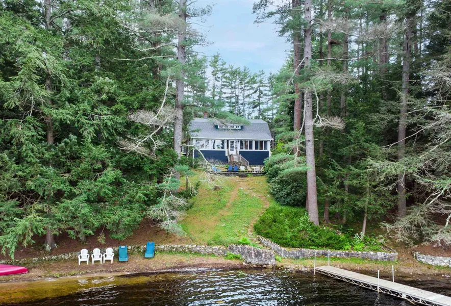 Rare expansive waterfront retreat on 2 private acres! Updated with modern comforts, this charming historic chalet retains its timeless appeal. Step into the grand living room with a cozy fireplace and soak in breathtaking views of the lake, mountains, and vibrant seasonal foliage. Dine or unwind in the sun-drenched four-season sunroom. The main floor also includes two comfortable bedrooms, a bright home office, and an updated full bath. A spacious loft provides tons of flexible space for guests or recreation. The partially finished basement offers added versatility with room for play, laundry, and a half bath. Outside, relax on the stone patio or explore the pine-wooded lot featuring your own private beach, day dock, and scenic walking trails. Just across the street is the detached 2-car garage for toys and vehicles. Some furniture is included making this a turnkey rental, 4-season getaway, or your lakefront dream home. 18 minutes to Keene, 25 minutes to Brattleboro, 2 hrs to Boston.
