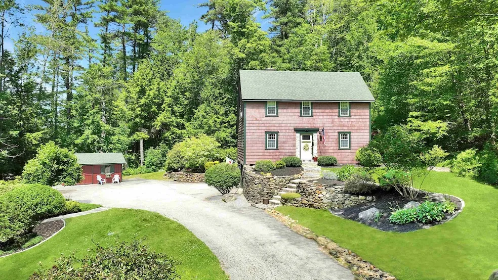 Enjoy Antique home charm with none of the work! Discover the perfect blend of classic New England charm and thoughtful modern updates in this beautifully crafted Antique Reproduction Saltbox Colonial, set on 1.76 private, landscaped acres. Built in 1979, this home features wide pine floors, custom woodwork, and period-style finishes throughout, down to the light fixtures and door latches. The formal living room offers rich wood paneling, Indian shutters, and a brick fireplace. A spacious kitchen with CAFE appliances (new in 2024) and granite countertop is open to the dining room with gas stove, for easy entertaining. Step down into a stunning sunroom featuring arched wood beams with french doors to the patio and gardens. A full bath and guest bedroom or office complete the first floor. Upstairs includes a primary suite with a walk-in closet, a 2nd bedroom, and full bath. A laundry room and office are on the lower level, plus a 2-car garage. Outdoors, enjoy stone walls, granite steps, perennial gardens, an oversized Amish-built shed, and gazebo. When the leaves fall, enjoy seasonal mountain views from the upper level. Located minutes from downtown Jaffrey and the trails of Mount Monadnock, this home offers peace, privacy, and unmatched New England style! Come experience this one-of-a-kind property today!