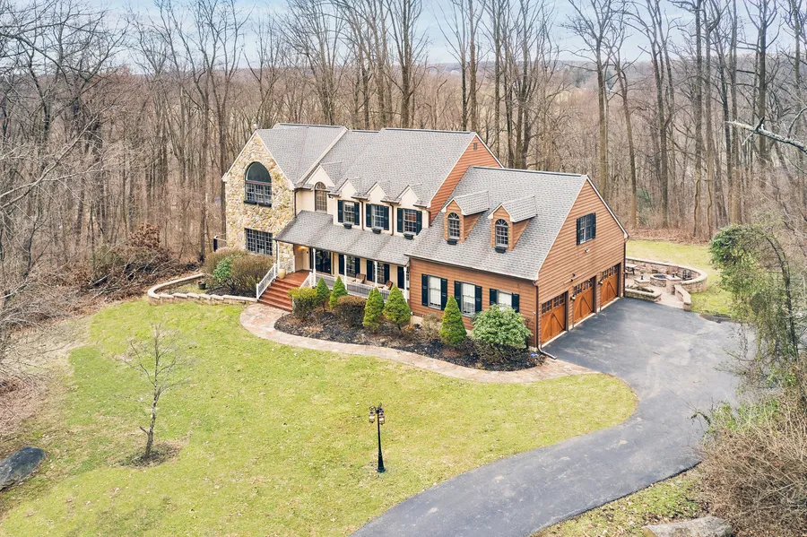 This incredible move-in ready property offers complete privacy and is nestled on a breathtaking 4.1 acre lot, set back from the street on a circular driveway at the end of a beautiful cul-de-sac. You'll be impressed by this custom-built residence and separate Amish -built 2-story cedar "party barn" featuring a bright, spacious open floor plan, sun-filled windows, neutral decor, stunning hand- crafted millwork, moldings and built-ins and plenty of comfortable interior and exterior living, working and entertaining spaces. The main residence has been meticulously updated and improved, designed to be maintenance-free for years to come with its new roof, three new Amish-built solid wood garage doors that were just sanded, stained and waterproofed, two new composite decks with modern cable-wire railings and a custom-designed EP Henry paver patio that wraps around the entire outside of the house. Features include gracious room sizes throughout, gourmet kitchen with access to the expansive deck, tongue and groove cherry cabinets, granite countertops and chef's appliances, open breakfast room, adjacent expansive family room with vaulted ceiling, skylights and impressive stone fireplace, private study/office/library with private deck and hand-carved walnut paneling and built-ins crafted in Lancaster County by world-famous designer Knudsen Woodworking, large dining room with additional balcony, hand-carved walnut wainscoting, millwork and Pella French doors looking out to 4.1 acres of nature's beauty. Adjacent to the dining room is a second full wet bar and wine refrigerator. The second level includes a spacious master suite with sun-filled bedroom featuring cathedral ceilings, freshly painted neutral decor, luxurious en -suite bathroom and expanded walk-in closets with a walk-up dressing room. Along the second floor hallway featuring wood floors, you'll find 4 additional bedrooms, one full hallway bath and a second primary suite with a 5th bedroom that spans the footprint of the entire three-car garage. This space includes an en-suite marble bathroom with high-end Kohler fixtures and a separately controlled HVAC system. The finished walkout lower level offers flexible living and entertaining spaces with new, durable Karastan wool carpeting throughout, full bath, wiring for surround sound speakers, complete wet bar with wine refrigerator, full refrigerator, freezer, custom cherry cabinetry and built-ins. Additional valuable improvements include a security system, safety floodlights in the woods and a generator w/ a complete house electrical panel. All stucco has been invasively tested and fully remediated as recommended in 2020. The sole owner of 25 years has invested over $500,000 in upgrades to this exquisite, private, and safe oasis. Paoli Train Station is 7.6 miles from the home & Amtrak to NYC is 1 hour 50 minutes. This property is a must-see to believe! Close to highly acclaimed Downingtown Area Schools and the prestigious Stem Academy.