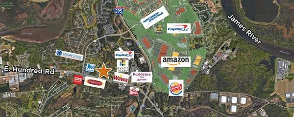3 acre lot for sale. Over 200 ft. frontage on Rt. 10. Zoned C-3. Utilities water and sewer in place, shared storm water. Join EVB under construction. Close to Meadowville Tech Park with Amazon, Capital One and Northrup Grumman as major tenants. E. Hundred VPD: 40,463. Owner may consider division of parcel.