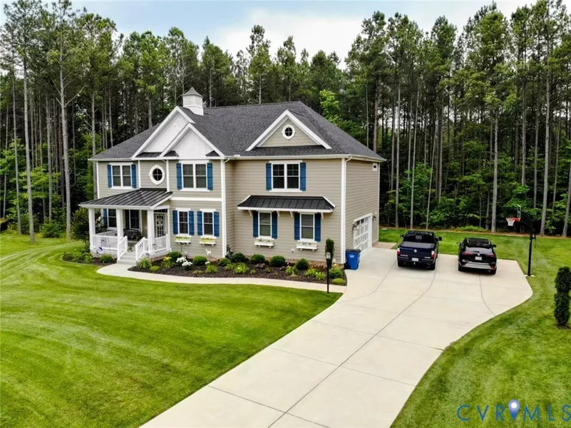 Located in The Highlands community, this wonderful property sits on 2.7 private acres at the end of a cul-de-sac, with 1.5 acres fully landscaped. This house provides 5,065 total square feet, with 3,607 finished square-feet and an additional 1458 unfinished square-feet basement; this home features 4 bedrooms, each with a private bathroom and walk-in closet. Interior details include shiplap and board & batten accents, custom closets, hardwood floors in the main living areas, and new nylon Berber carpet in all bedrooms. The open-concept kitchen includes an oversized island, upgraded smart fridge, range top, microwave, double ovens, and granite and quartz countertops. Additional features include a large walk-in pantry and a mudroom/office with custom-made office furniture. The upstairs laundry room offers cabinetry, sink, and storage space. Large bonus/theater room located above the garage. The unfinished insulated basement bathroom is rough plumbed. Practical upgrades include motion-sensor closet lights, a tankless water heater, sump pumps, steel framing, and an oversized two-door garage with space for three vehicles. Outdoor features include a front porch with a hanging bench swing, a fire pit, basketball hoop, cement patio, all-home generator, and a full-yard irrigation system. Two additional patios are included: one off the master bedroom and a covered patio off the kitchen. In this community, residents enjoy a clubhouse, two swimming pools, a fitness center, playgrounds, paddleboard, tennis courts, and scenic walking and biking trails The property is located in the Chesterfield County school district, zoned for Gates Elementary, Matoaca Middle, and Matoaca High School.