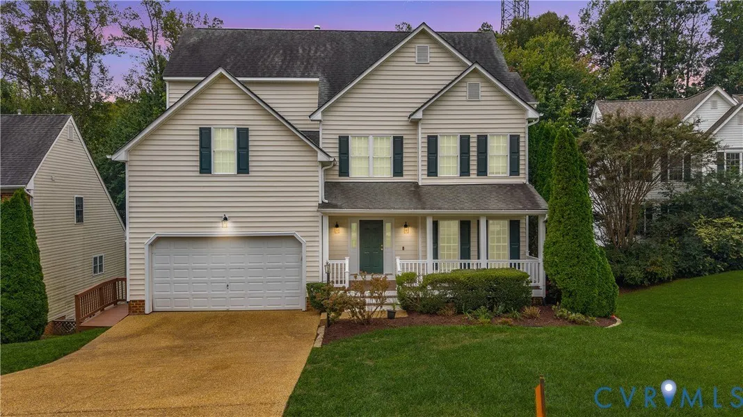 Welcome to 1301 Hawkins Wood Circle in the The Grove neighborhood of Midlothian. This move-in ready vinyl-sided basement home consists of 5 bedrooms & 3.5 bathrooms over 3,459 sqft of finished living space over 3 levels w/ walk-up roughed-in attic that can be finished for an additional 1000+ sqft (perfect for multi-generational families). Upon entering, you are greeted with hardwood floors & crown moulding in the foyer and formal living room. The oversized formal dining room is ready for entertaining family during the holidays with tray ceiling, chair rail & crown mouldings. The open-concept eat-in kitchen has a pantry, breakfast bar & recessed lighting and flows into the family room with gas fireplace & walk-out access to the private rear deck. The finished basement features a large entertaining space/rec room (perfect for football on Sundays or kids space) with an additional fireplace, wet bar, full bathroom, ample storage & a flexible guest bedroom space. The 2nd floor of the home is is highlighted with a primary bedroom w/ ensuite bathroom & a large walk-in closet. This level of the home is completed with 3 additional bedrooms, a hallway full bathroom & 2nd floor laundry room (washer/dryer convey). The interior of the home is completed with a full walk-up attic that is roughed-in for an additional full bathroom & can be finished for more sqft for the growing family - bring your contractor & vision! The home features a 2-car attached garage with pedestrian door access and room for storage/workshop. The current owners recently completed a full redesign of the front porch, rear deck & patio space by adding all Trex decking & deck rail with a beautiful stone paver patio w/ fireplace overlooking the backyard. The large .54 acre lot backs up to mature trees & a tranquil stream that kids and pets love to play around. The Grove HOA includes a clubhouse, pool, trails, playground, pond access & a sports field in the yearly dues. Close to everything Midlothian has to offer w/ top schools & endless shopping.