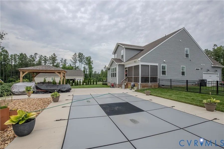 ""Pristine and beautiful, just four years old, with established green lawn, extensive landscaping, expanded irrigation system with additional misters in flower beds, all the extras that new construction does not offer. Enjoy the beautiful, salt water, inground pool with concrete surround and an approx. 8' sun lounger and concrete decking with 12'x14' gazebo. Add your grill/outdoor kitchen and enjoy your own personal outdoor oasis. Interior features include an open floor plan with Luxury Vinyl Plank flooring throughout the first floor, tray ceiling in foyer, coffered ceiling in the spacious, open living room with gas fireplace, and plantation blinds throughout. Separate dining room with barn doors and stunning kitchen with 7'3""""x5'2"""" beautiful granite island and farmhouse sink, stainless steel appliances, including GE SS 4 door refrigerator, subway tile backsplash, wall convection oven, microwave and walk in pantry. The Morning Room/breakfast area overlooks the kitchen and living room. Lovely primary suite with tray ceiling and attached primary bath featuring his and hers vanities, walk in tiled shower, large, walk in closet upgraded by Closet Mate. Additional guest room and bath on first floor. Upstairs features a loft/family room with access to the floored, walk in attic, two additional bedrooms, a separate office space and full bath. Enjoy the peace and security of a whole house generator and the property line extends into the woods beyond the fencing. *The interior Italian Murano hand blown chandelier above the stairs will be removed unless purchasers would like to purchase it. See agent for pricing. There is a Pest Control System contract in place covering yearly termite and quarterly pest coverage.""