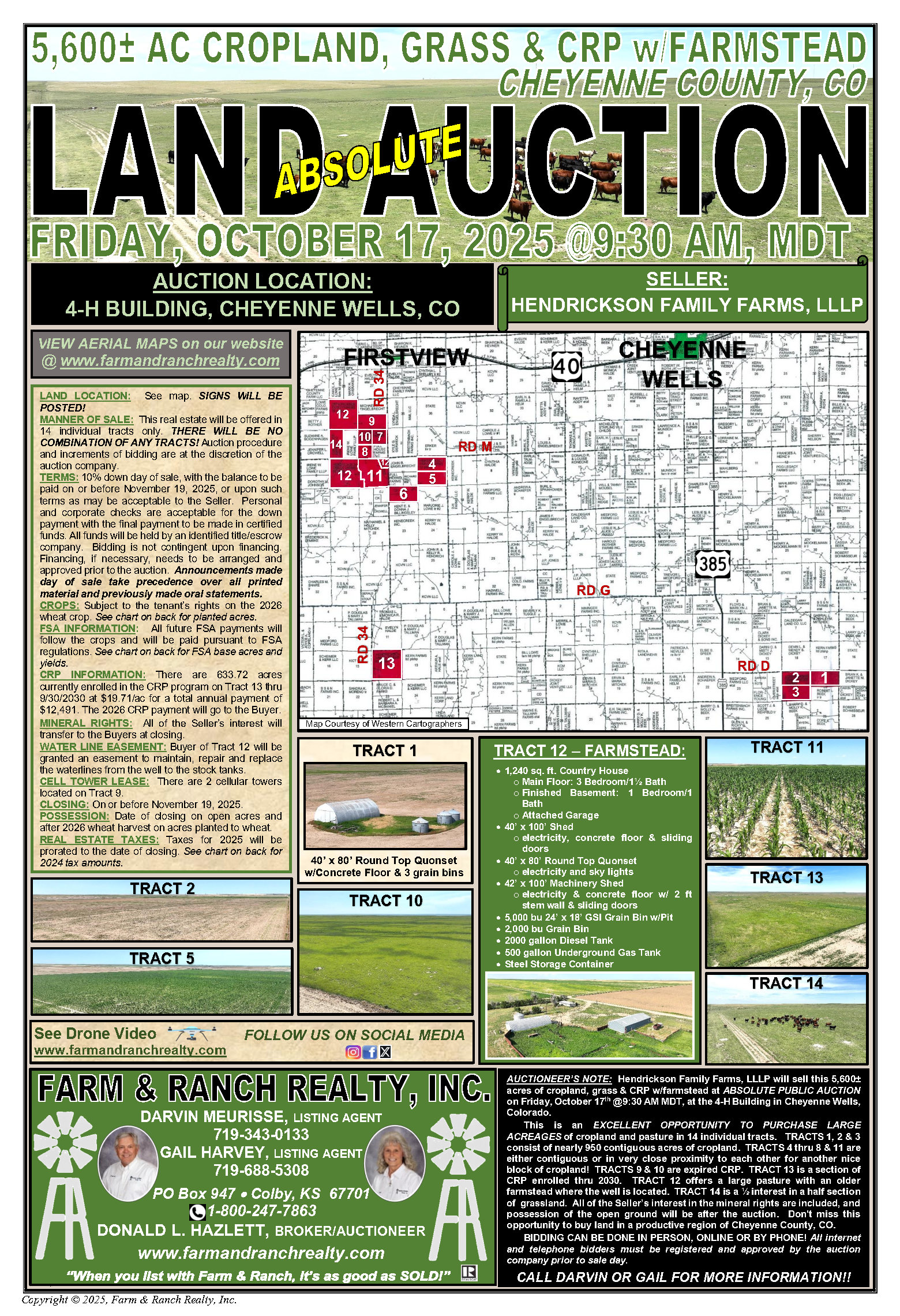 This is an EXCELLENT OPPORTUNITY TO PURCHASE LARGE ACREAGES of cropland and pasture in 14 individual tracts. TRACTS 1, 2 & 3 consist of nearly 950 contiguous acres of cropland. TRACTS 4 thru 8 & 11 are either contiguous or in very close proximity to each other for another nice block of cropland! TRACTS 9 & 10 are expired CRP. TRACT 13 is a section of CRP enrolled thru 2030. TRACT 12 offers a large pasture with an older farmstead where the well is located. TRACT 14 is a ½ interest in a half section of grassland. All of the Seller’s interest in the mineral rights are included, and possession of the open ground will be after the auction. Don't miss this opportunity to buy land in a productive region of Cheyenne County, CO.