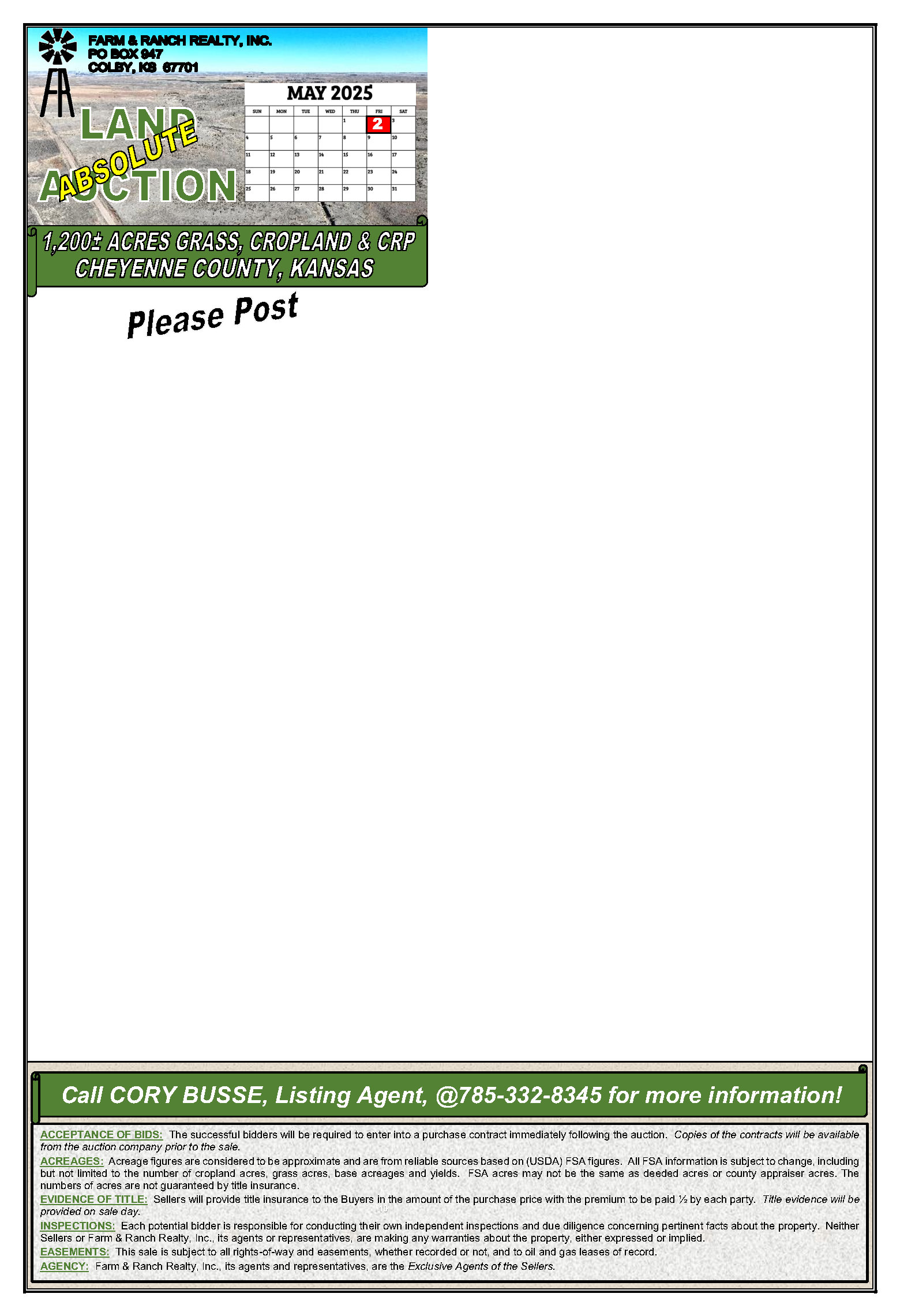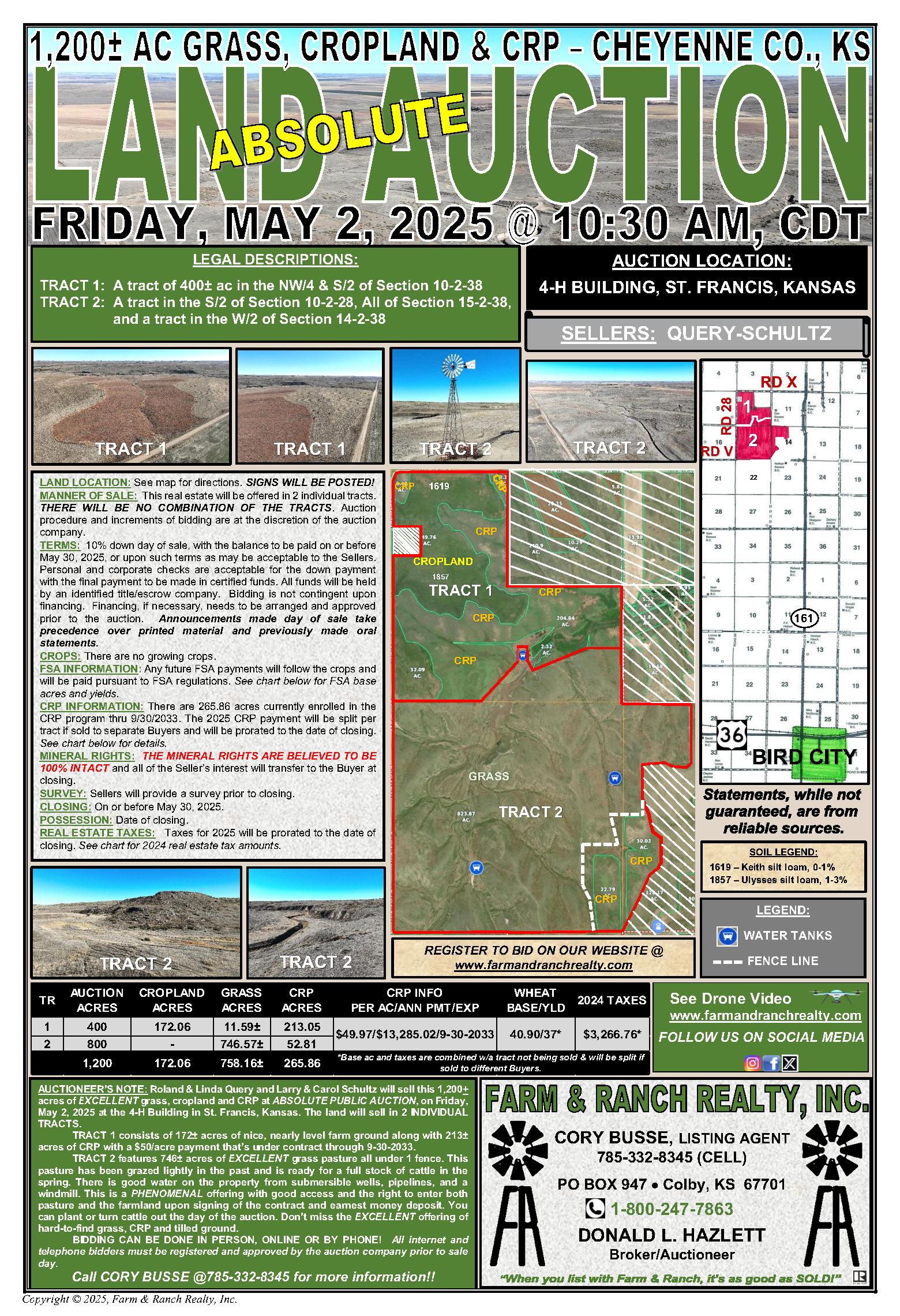 AUCTIONEERS NOTE: Roland & Linda Query and Larry & Carol Schultz will sell this 1,200+ acres of EXCELLENT grass, cropland and CRP at ABSOLUTE PUBLIC AUCTION, on Friday, May 2, 2025 at the 4-H Building in St. Francis, Kansas. The land will sell in 2 INDIVIDUAL TRACTS.