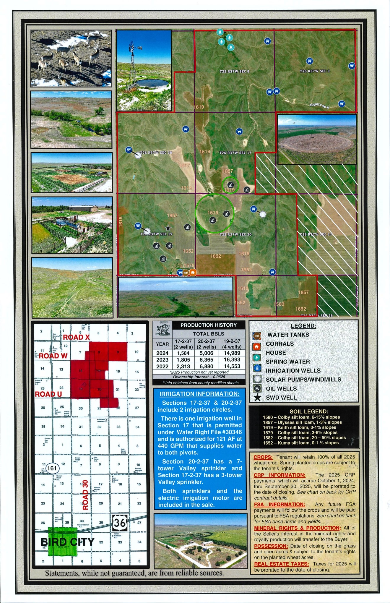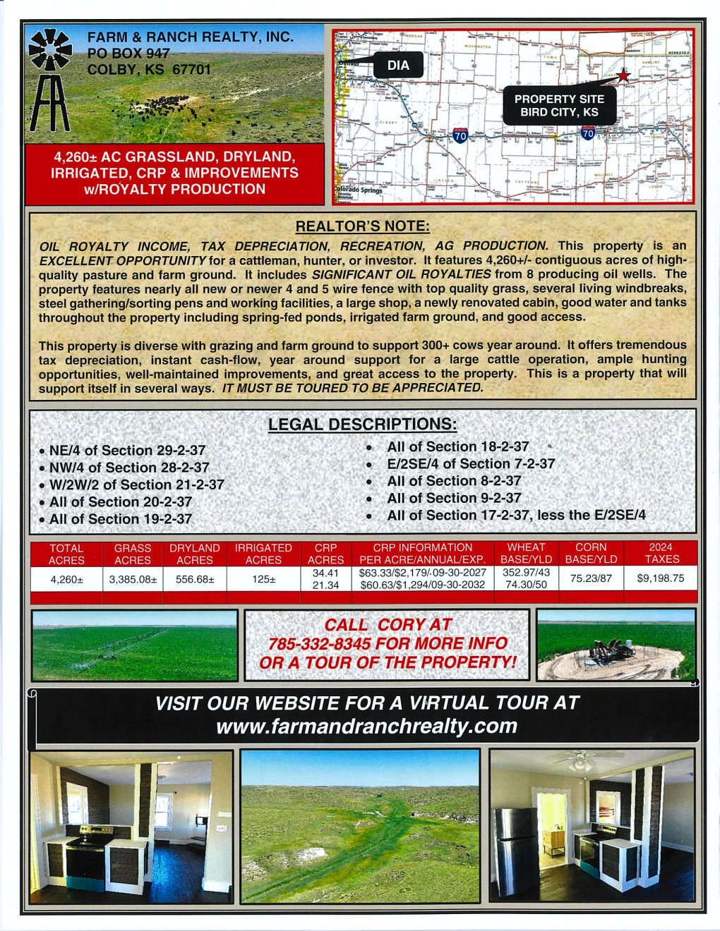 This property is an EXCELLENT OPPORTUNITY for a cattleman, hunter, or investor. It features 4,260+/- contiguous acres of high-quality pasture and farm ground. It includes SIGNIFICANT OIL ROYALTIES from 8 producing oil wells. The property features nearly all new or newer 4 and 5 wire fence with top quality grass, several living windbreaks, steel gathering/sorting pens and working facilities, a large shop, a newly renovated cabin, good water and tanks throughout the property including spring-fed ponds, irrigated farm ground, and good access.